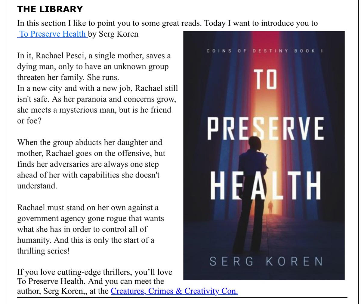 "This story kept me guessing. I don’t want to give too much away. It starts with the mystery of the gold coin, then the threats from people trying to get it. Then there are the strange things that happen. Beyond that there’s some mysterious greater danger involving the government and the project. It’s also a thriller. The protagonist, and her family and friends, are under great danger. If that’s not enough, they also need to save the world. Themes include a computer “neural network” that cannot merely predict the future but control it, and an artificial life that came from it. It’s both interesting and exciting. "