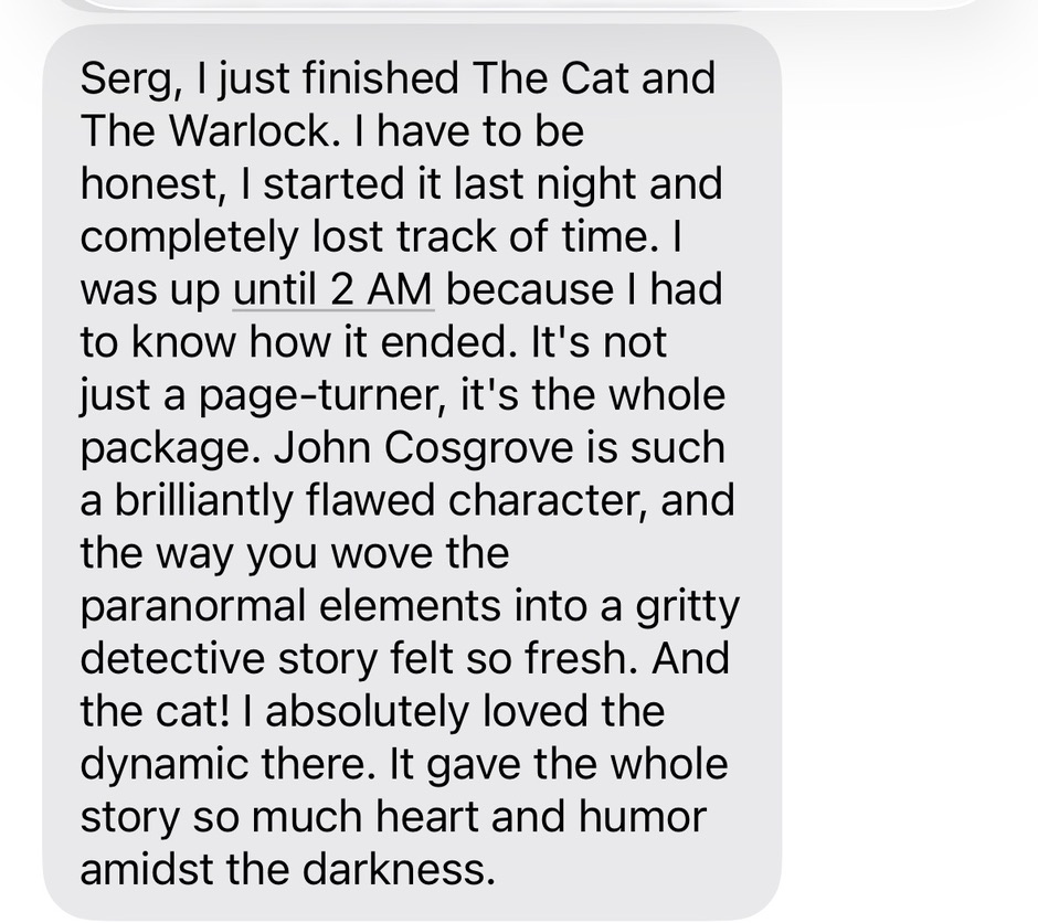 When John Cosgrove, an out-of-work detective, gets awoken in the middle of the night by a series of blood-curdling screams on Halloween, his first thought was that it had to be a prank. Unfortunately, it's an all too real murder… and the third of the night. Roped into helping his former lover investigate the gruesome and seemingly paranormal case, John finds himself juggling a whirlwind of memories, an unexpected killer, and a new cat that's determined he's now her human.